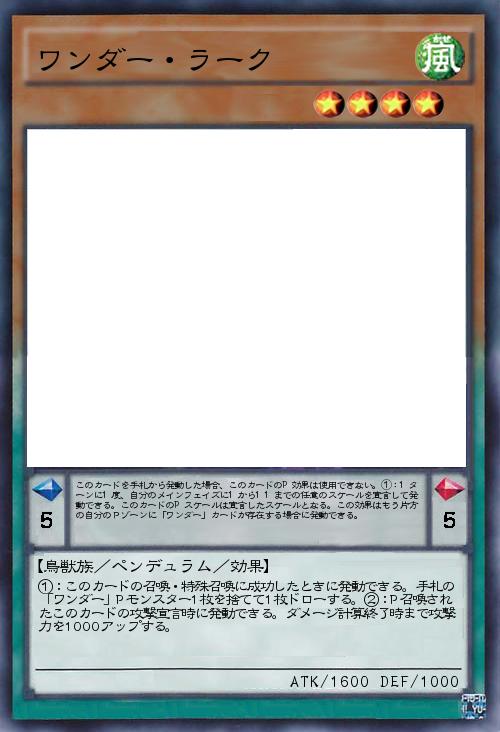 | ①:このカードの召喚・特殊召喚に成功したときに発動できる。手札の「ワンダー」Pモンスター1枚を捨てて1枚ドローする。②:P召喚されたこのカードの攻撃宣言時に発動できる。ダメージ計算終了時まで攻撃力を1000アップする。 | |||