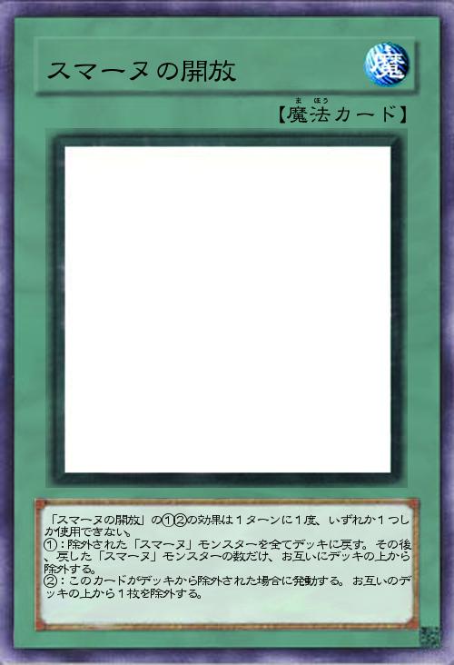 | 「スマーヌの開放」の①②の効果は1ターンに1度、いずれか1つしか使用できない。 ①:除外された「スマーヌ」モンスターを全てデッキに戻す。その後、戻した「スマーヌ」モンスターの数だけ、お互いにデッキの上から除外する。 ②:このカードがデッキから除外された場合に発動する。お互いのデッキの上から1枚を除外する。 | |||