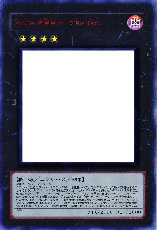 | 闇属性レベル4モンスター×3 このカードは自分フィールドのランク4の「希望皇ホープ」モンスターの上に重ねてX召喚することもできる。①:このカードのX召喚は無効化されない。②:X素材を持ったこのカードは効果では破壊されない。③:このカードがモンスターゾーンに存在する限り、自分フィールドのこのカード以外のモンスターは攻撃できない。④:このカードが「希望皇ホープ」モンスターをX素材としている場合、1ターンに1度、このカードのX素材を1つ取り除いて発動できる。相手フィールドのモンスターの攻撃力は2000ダウンし、このカードの攻撃力は500アップする。この効果で攻撃力が500以下になったモンスターを全て破壊し、破壊したモンスターの数×1000ダメージを相手に与える。 | |||