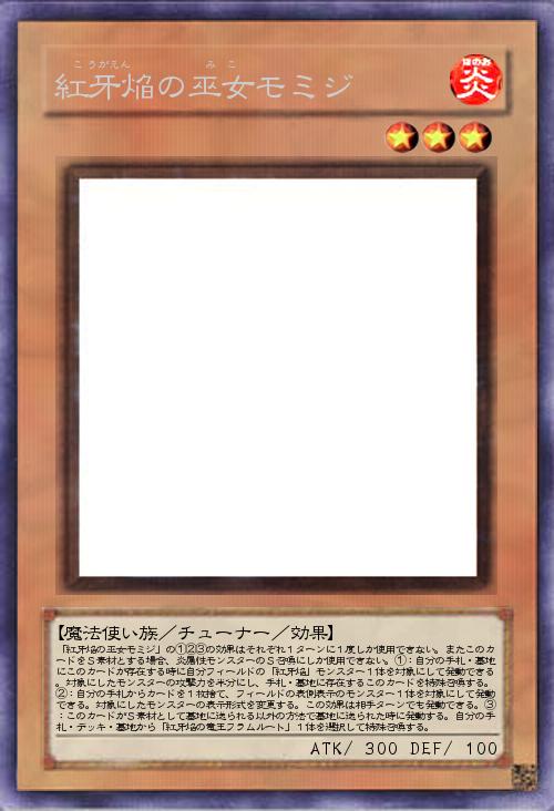| 「紅牙焔の巫女モミジ」の①②③の効果はそれぞれ1ターンに1度しか使用できない。またこのカードをS素材とする場合、炎属性モンスターのS召喚にしか使用できない。①:自分の手札・墓地にこのカードが存在する時に自分フィールドの「紅牙焔」モンスター1体を対象にして発動できる。対象にしたモンスターの攻撃力を半分にし、手札・墓地に存在するこのカードを特殊召喚する。②:自分の手札からカードを1枚捨て、フィールドの表側表示のモンスター1体を対象にして発動できる。対象にしたモンスターの表示形式を変更する。この効果は相手ターンでも発動できる。③:このカードがS素材として墓地に送られる以外の方法で墓地に送られた時に発動する。自分の手札・デッキ・墓地から「紅牙焔の竜王フラムルート」1体を選択して特殊召喚する。 | |||