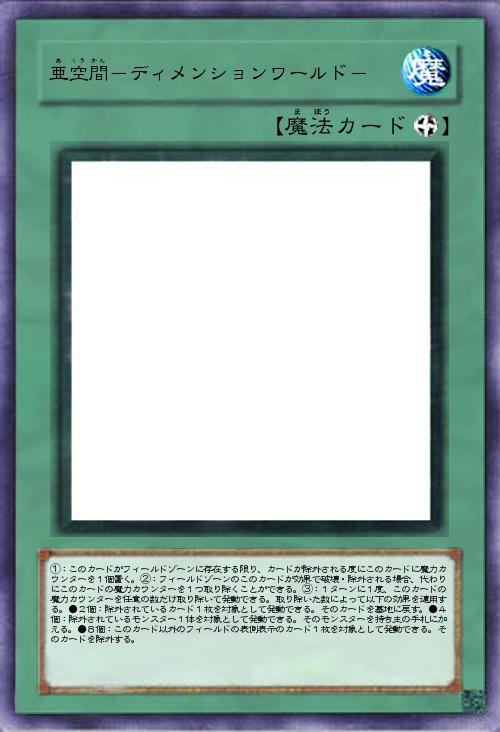 核となるフィールド魔法。若干混沌空間と被っていますが気にしない。混沌空間が除外されたモンスターの枚数を参照するのに対し、このカードはモンスター魔法罠のどれが除外されてもカウンターが乗る代わりに1度に複数枚除外してもカウンターが乗るのは1個だけ。