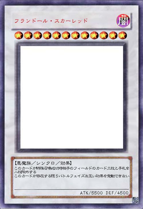 | このカードが特殊召喚成功時相手のフィールドのカード三枚と手札を二枚除外する このカードが存在する限りバトルフェイズお互い効果を発動できない | |||