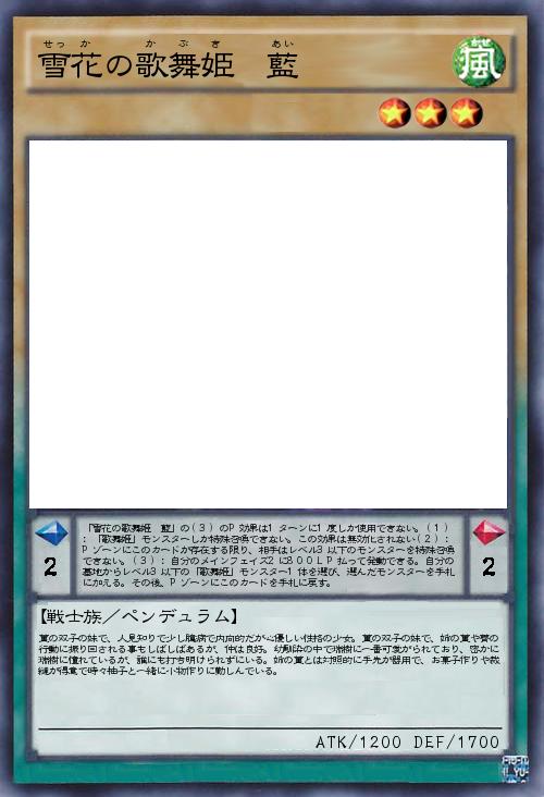 | 「雪花の歌舞姫 藍」の(3)のP効果は1ターンに1度しか使用できない。(1):「歌舞姫」モンスターしか特殊召喚できない。この効果は無効化されない(2):Pゾーンにこのカードが存在する限り、相手はレベル3以下のモンスターを特殊召喚できない。(3):自分のメインフェイズ2に800LP払って発動できる。自分の墓地からレベル3以下の「歌舞姫」モンスター1体を選び、選んだモンスターを手札に加える。その後、Pゾーンにこのカードを手札に戻す。 | |||