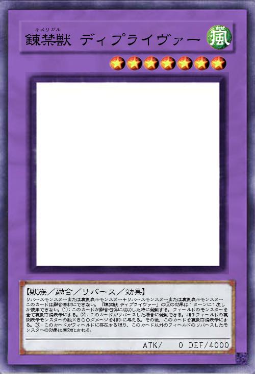 | リバースモンスターまたは裏側表示モンスター+リバースモンスターまたは裏側表示モンスター このカードは融合素材にできない。「錬禁獣 ディプライヴァー」の②の効果は1ターンに1度しか使用できない。①:このカードが融合召喚に成功した時に発動する。フィールドのモンスターを全て裏側守備表示にする。②:このカードがリバースした場合に発動できる。相手フィールドの裏側表示モンスターの数×800ダメージを相手に与える。その後、このカードを裏側守備表示にする。③:このカードがフィールドに存在する限り、このカード以外のフィールドのリバースしたモンスターの効果は無効化される。 | |||