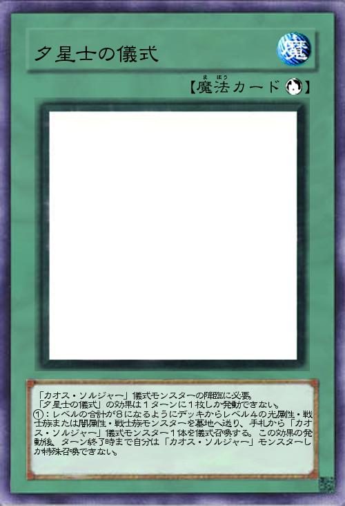 | 「カオス・ソルジャー」儀式モンスターの降臨に必要。 「夕星士の儀式」の効果は1ターンに1枚しか発動できない。 ①:レベルの合計が8になるようにデッキからレベル4の光属性・戦士族または闇属性・戦士族モンスターを墓地へ送り、手札から「カオス・ソルジャー」儀式モンスター1体を儀式召喚する。この効果の発動後、ターン終了時まで自分は「カオス・ソルジャー」モンスターしか特殊召喚できない。 | |||