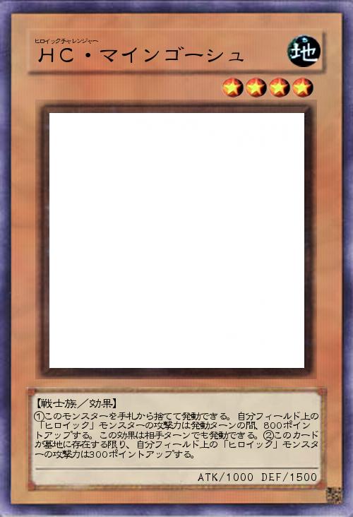| ①このモンスターを手札から捨てて発動できる。自分フィールド上の「ヒロイック」モンスターの攻撃力は発動ターンの間、800ポイントアップする。この効果は相手ターンでも発動できる。②このカードが墓地に存在する限り、自分フィールド上の「ヒロイック」モンスターの攻撃力は300ポイントアップする。 | |||