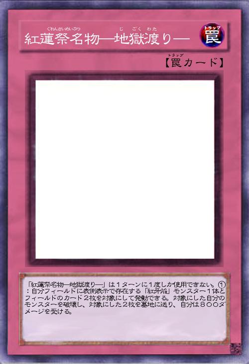 | 「紅蓮祭名物―地獄渡り―」は1ターンに1度しか使用できない。①:自分フィールドに表側表示で存在する「紅牙焔」モンスター1体とフィールドのカード2枚を対象にして発動できる。対象にした自分のモンスターを破壊し、対象にした2枚を墓地に送り、自分は800ダメージを受ける。 | |||