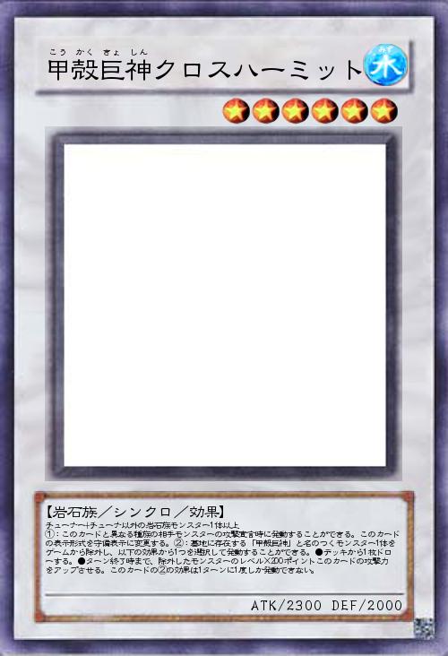 「孤高の深淵よりよみがえりし巨神よ、その力を持ってこの地を海洋に染めん。シンクロ召喚!何となく口上が思いついたので…カード名はヤドカリをモチーフにしています。ミジャルコート(☆1)の効果でバーナクルイン(☆5)を呼ぶことで簡単に出せます。効果は、墓地の甲殻巨神を除外して1ドローか、攻撃力をアップさせるものです。先ほどの方法で出せば、墓地にバーナクルインがいるので、打点を1000ポイントはアップすることができます。」(2016-02-04 14:40)