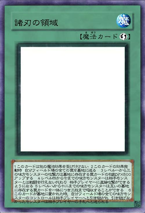 | 1このカードは他の魔法効果を受け付けない 2このカードの効果発動時 自分フィールド場の全ての罠を墓地に送る 3レベル一から三の味方モンスターの攻撃力は墓地に存在する罠カードの枚数分×800アップする 4レベル四から七までの味方モンスターは相手モンスターとは戦闘を行えない代わり 相手プレイヤーに直接攻撃ができるようになる 5レベル八から十二までの味方モンスターは互いの墓地に存在する罠カードを一体につき三枚まで吸収することができる 6このカードが墓地に置かれた時、自分フィールド場の全ての味方モンスターのコントロールは相手プレイヤーへと引き継がれ 引き継げなかったモンスターは相手プレイヤーの手札へと送られる | |||
