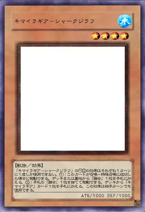| 「キマイラギア-シャークジラフ」の①②の効果はそれぞれ1ターンに1度しか使用できない。①:このカードが召喚・特殊召喚に成功した場合に発動できる。デッキまたは墓地から「融合」1枚を手札に加える。②:手札の「融合」1枚を捨てて発動できる。デッキから「キマイラギア」カード1枚を手札に加える。この効果は相手ターンでも使用できる。 | |||