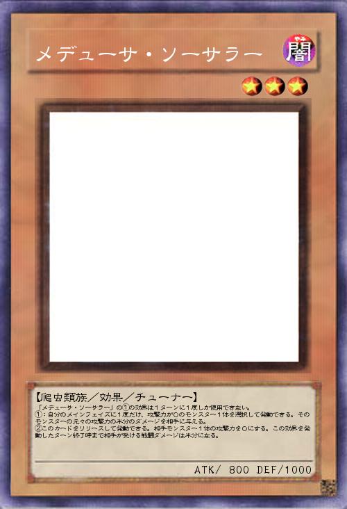 「メデューサ2体目。徹底的に攻撃力0に粘着するウーマン。ウィッチから呼び出せるために、アドを取る効果ではなく、ライフアドを取る効果にしました(当初はさらにアドを稼ぐクソゲーモンスターでしたが、投稿時に急きょ変更しました)