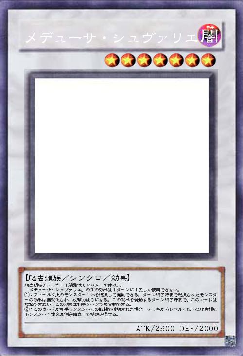 | 爬虫類族チューナー+闇属性モンスター1体以上 「メデューサ・シュヴァリエ」の①の効果は1ターンに1度しか使用できない。 ①:フィールド上のモンスター1体を選択して発動できる。ターン終了時まで選択されたモンスターの効果は無効化され、攻撃力は0になる。この効果を発動するターン終了時まで、このカードは攻撃できない。この効果は相手ターンでも発動できる。 ②:このカードが相手モンスターとの戦闘で破壊された場合、デッキからレベル4以下の爬虫類族モンスター1体を裏側守備表示で特殊召喚する。 | |||