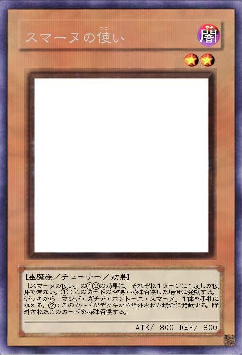 | 「スマーヌの使い」の①②の効果は、それぞれ1ターンに1度しか使用できない。①:このカードの召喚・特殊召喚した場合に発動する。デッキから「マジデ・ガチデ・ホントーニ・スマーヌ」1体を手札に加える。②:このカードがデッキから除外された場合に発動する。除外されたこのカードを特殊召喚する。 | |||