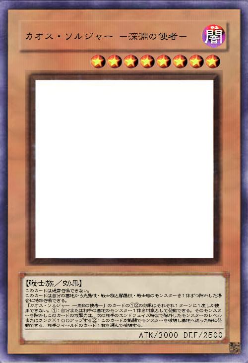 | このカードは通常召喚できない。 このカードは自分の墓地から光属性・戦士族と闇属性・戦士族のモンスターを1体ずつ除外した場合に特殊召喚できる。 「カオス・ソルジャー -深淵の使者-」のカードの①②の効果はそれぞれ1ターンに1度しか使用できない。①:自分または相手の墓地のモンスター1体を対象として発動できる。そのモンスターを除外しこのカードの攻撃力は、次の相手のエンドフェイズ時まで除外したモンスターのレベルまたはランク×100アップする②:このカードが戦闘でモンスターを破壊し墓地へ送った時に発動できる。相手フィールドのカード1枚を選んで破壊する。 | |||