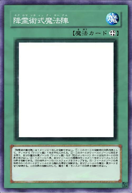 | 「降霊術式魔法陣」は1ターンに1枚しか発動できない。①:このカードの発動時の効果処理として、デッキから「ウィジャ盤」1枚を手札に加える。②:このカードがフィールドゾーンに存在する限り、自分の魔法&罠ゾーンの「ウィジャ盤」及び「死のメッセージ」カードは他のカードの効果を受けない。③:1ターンに1度、自分フィールドの闇属性モンスター1体をリリースしてこの効果を発動できる。次の相手ターンのバトルフェイズをスキップする。④:フィールドゾーンの表側表示のこのカードがフィールドから離れた場合に発動する。自分フィールドの魔法・罠カードを全て破壊する。この効果の発動に対して、魔法・罠・モンスターの効果を発動できない。 | |||