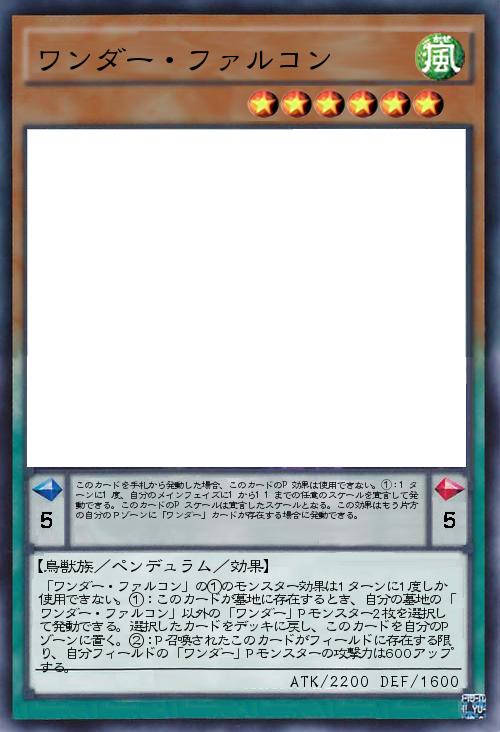 | 「ワンダー・ファルコン」の①のモンスター効果は1ターンに1度しか使用できない。①:このカードが墓地に存在するとき、自分の墓地の「ワンダー・ファルコン」以外の「ワンダー」Pモンスター2枚を選択して発動できる。選択したカードをデッキに戻し、このカードを自分のPゾーンに置く。②:P召喚されたこのカードがフィールドに存在する限り、自分フィールドの「ワンダー」Pモンスターの攻撃力は600アップする。 | |||