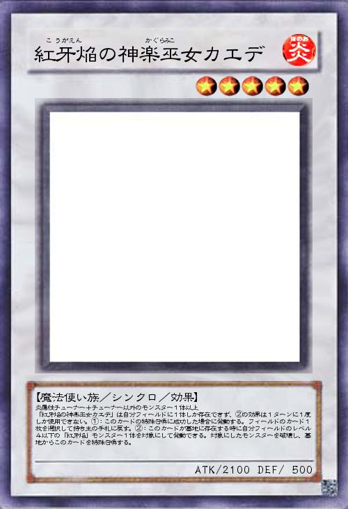 | 炎属性チューナー+チューナー以外のモンスター1体以上 「紅牙焔の神楽巫女カエデ」は自分フィールドに1体しか存在できず、②の効果は1ターンに1度しか使用できない。①:このカードの特殊召喚に成功した場合に発動する。フィールドのカード1枚を選択して持ち主の手札に戻す。②:このカードが墓地に存在する時に自分フィールドのレベル4以下の「紅牙焔」モンスター1体を対象にして発動できる。対象にしたモンスターを破壊し、墓地からこのカードを特殊召喚する。 | |||