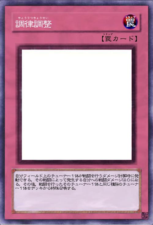 | 自分フィールド上のチューナー1体が戦闘を行うダメージ計算時に発動できる。その戦闘によって発生する自分への戦闘ダメージは0になる。その後、戦闘を行ったそのチューナー1体と同じ種族のチューナー1体をデッキから特殊召喚する。 | |||