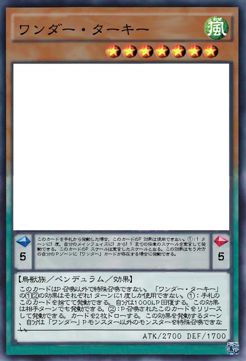 | このカードはP召喚以外で特殊召喚できない。「ワンダー・ターキー」の①②の効果はそれぞれ1ターンに1度しか使用できない。①:手札のこのカードを捨てて発動できる。自分は1000LP回復する。この効果は相手ターンでも発動できる。②:P召喚されたこのカードをリリースして発動できる。カードを2枚ドローする。この効果を発動するターン、自分は「ワンダー」Pモンスター以外のモンスターを特殊召喚できない。 | |||