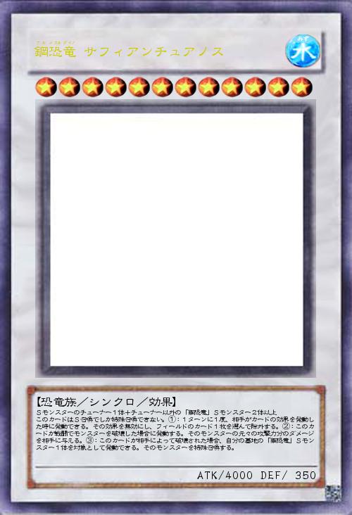 | Sモンスターのチューナー1体+チューナー以外の「鋼恐竜」Sモンスター2体以上 このカードはS召喚でしか特殊召喚できない。①:1ターンに1度、相手がカードの効果を発動した時に発動できる。その効果を無効にし、フィールドのカード1枚を選んで除外する。②:このカードが戦闘でモンスターを破壊した場合に発動する。そのモンスターの元々の攻撃力分のダメージを相手に与える。③:このカードが相手によって破壊された場合、自分の墓地の「鋼恐竜」Sモンスター1体を対象として発動できる。そのモンスターを特殊召喚する。 | |||