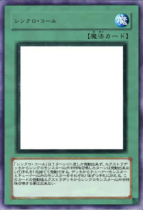 | 「シンクロ・コール」は1ターンに1度しか発動出来ず、エクストラデッキからシンクロモンスター以外を特殊召喚したターンは発動出来ない①手札を1枚捨てて発動できる。デッキからチューナーモンスターとチューナー以外のモンスターをそれぞれ1体ずつ手札に加える。このカードの発動後エクストラデッキからシンクロモンスター以外を特殊召喚する事は出来ない | |||