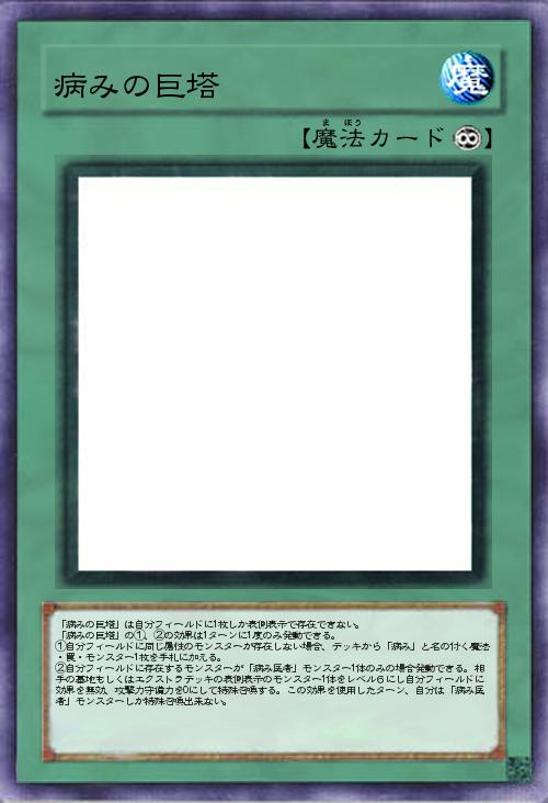 | 「病みの巨塔」は自分フィールドに1枚しか表側表示で存在できない。 「病みの巨塔」の①、②の効果は1ターンに1度のみ発動できる。 ①自分フィールドに同じ属性のモンスターが存在しない場合、デッキから「病み」と名の付く魔法・罠・モンスター1枚を手札に加える。 ②自分フィールドに存在するモンスターが「病み医者」モンスター1体のみの場合発動できる。相手の墓地もしくはエクストラデッキの表側表示のモンスター1体をレベル6にし自分フィールドに効果を無効、攻撃力守備力を0にして特殊召喚する。この効果を使用したターン、自分は「病み医者」モンスターしか特殊召喚出来ない。 | |||