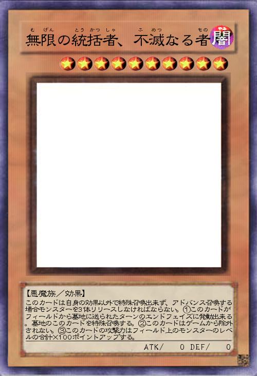 | このカードは自身の効果以外で特殊召喚出来ず、アドバンス召喚する場合モンスターを3体リリースしなければならない。①このカードがフィールドから墓地に送られたターンのエンドフェイズに発動出来る。墓地のこのカードを特殊召喚する。②このカードはゲームから除外されない。③このカードの攻撃力はフィールド上のモンスターのレベルの合計×100ポイントアップする。 | |||