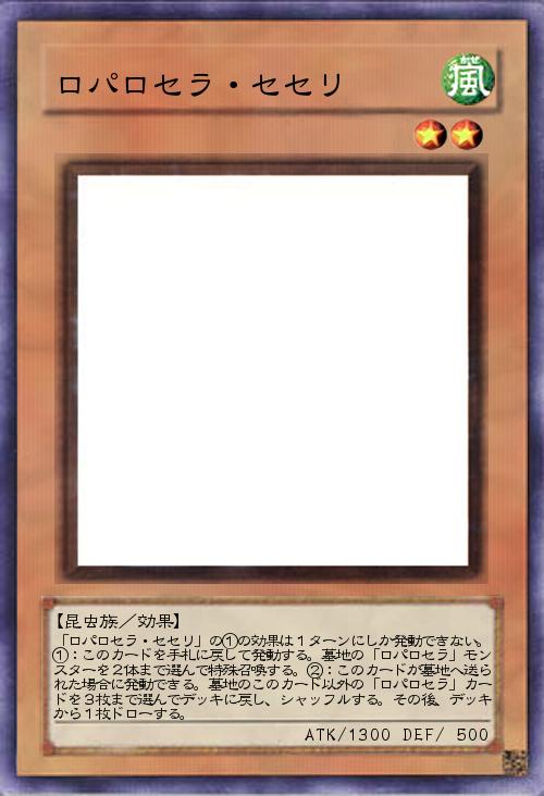 | 「ロパロセラ・セセリ」の①の効果は1ターンにしか発動できない。①:このカードを手札に戻して発動する。墓地の「ロパロセラ」モンスターを2体まで選んで特殊召喚する。②:このカードが墓地へ送られた場合に発動できる。墓地のこのカード以外の「ロパロセラ」カードを3枚まで選んでデッキに戻し、シャッフルする。その後、デッキから1枚ドローする。 | |||