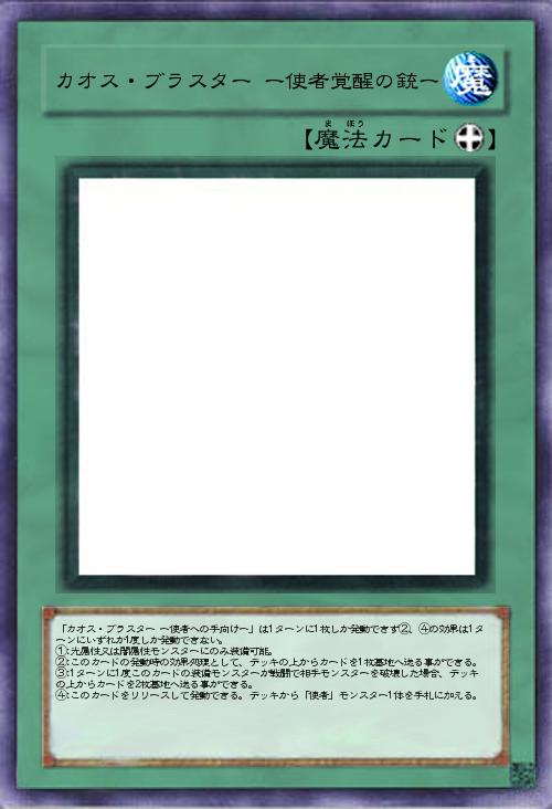 | 「カオス・ブラスター ー使者への手向けー」は1ターンに1枚しか発動できず②、④の効果は1ターンにいずれか1度しか発動できない。 ①:光属性又は闇属性モンスターにのみ装備可能。 ②:このカードの発動時の効果処理として、デッキの上からカードを1枚墓地へ送る事ができる。 ③:1ターンに1度このカードの装備モンスターが戦闘で相手モンスターを破壊した場合、デッキの上からカードを2枚墓地へ送る事ができる。 ④:このカードをリリースして発動できる。デッキから「使者」モンスター1体を手札に加える。 | |||