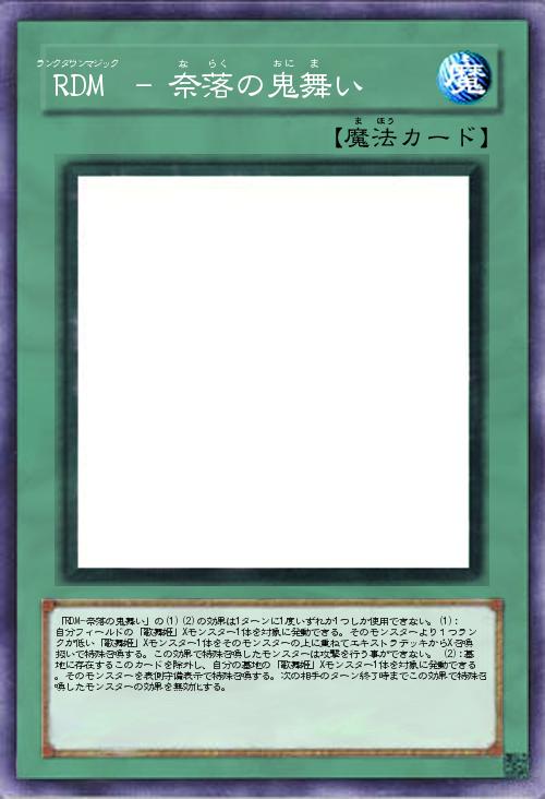 | 「RDM-奈落の鬼舞い」の(1)(2)の効果は1ターンに1度いずれか1つしか使用できない。(1):自分フィールドの「歌舞姫」Xモンスター1体を対象に発動できる。そのモンスターより1つランクが低い「歌舞姫」Xモンスター1体をそのモンスターの上に重ねてエキストラデッキからX召喚扱いで特殊召喚する。この効果で特殊召喚したモンスターは攻撃を行う事ができない。 (2):墓地に存在するこのカードを除外し、自分の墓地の「歌舞姫」Xモンスター1体を対象に発動できる。そのモンスターを表側守備表示で特殊召喚する。次の相手のターン終了時までこの効果で特殊召喚したモンスターの効果を無効化する。 | |||