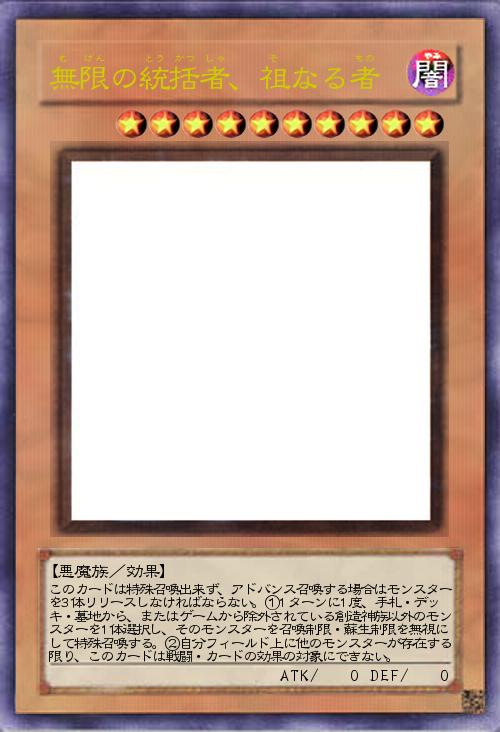 | このカードは特殊召喚出来ず、アドバンス召喚する場合はモンスターを3体リリースしなければならない。①1ターンに1度、手札・デッキ・墓地から、またはゲームから除外されている創造神族以外のモンスターを1体選択し、そのモンスターを召喚制限・蘇生制限を無視にして特殊召喚する。②自分フィールド上に他のモンスターが存在する限り、このカードは戦闘・カードの効果の対象にできない。 | |||