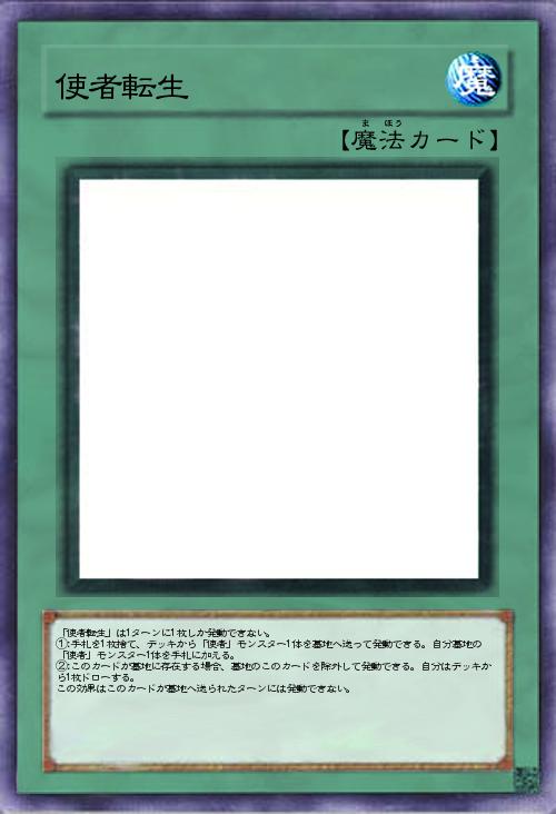 | 「使者転生」は1ターンに1枚しか発動できない。 ①:手札を1枚捨て、デッキから「使者」モンスター1体を墓地へ送って発動できる。自分墓地の「使者」モンスター1体を手札に加える。 ②:このカードが墓地に存在する場合、墓地のこのカードを除外して発動できる。自分はデッキから1枚ドローする。 この効果はこのカードが墓地へ送られたターンには発動できない。 | |||