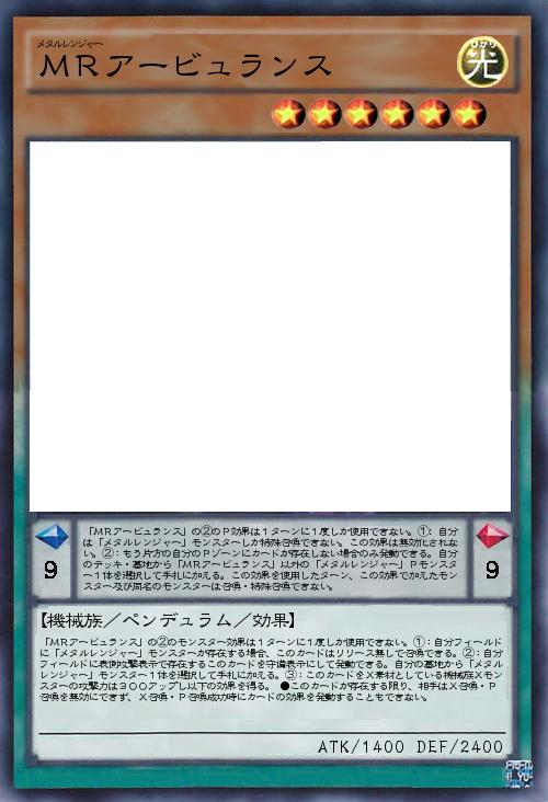 | 「MRアービュランス」の②のP効果は1ターンに1度しか使用できない。①:自分は「メタルレンジャー」モンスターしか特殊召喚できない。この効果は無効化されない。②:もう片方の自分のPゾーンにカードが存在しない場合のみ発動できる。自分のデッキ・墓地から「MRアービュランス」以外の「メタルレンジャー」Pモンスター1体を選択して手札に加える。この効果を使用したターン、この効果で加えたモンスター及び同名のモンスターは召喚・特殊召喚できない。 | |||
