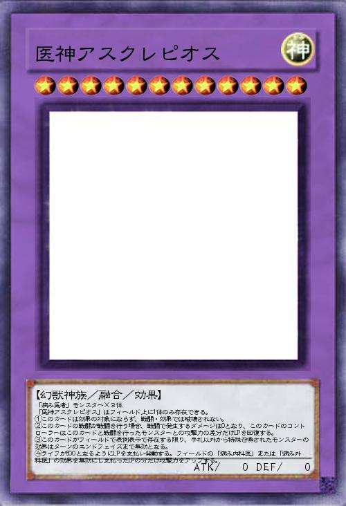 | 「病み医者」モンスター×3体 「医神アスクレピオス」はフィールド上に1体のみ存在できる。 ①このカードは効果の対象にならず、戦闘・効果では破壊されない。 ②このカードの戦闘が戦闘を行う場合、戦闘で発生するダメージは0となり、このカードのコントローラーはこのカードと戦闘を行ったモンスターとの攻撃力の差分だけLPを回復する。 ③このカードがフィールドで表側表示で存在する限り、手札以外から特殊召喚されたモンスターの効果はターンのエンドフェイズまで無効となる。 ④ライフが500となるようにLPを支払い発動する。フィールドの「病み内科医」または「病み外科医」の効果を無効にし支払ったLPの分だけ攻撃力をアップする。 | |||