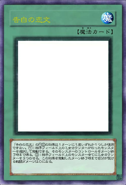 | 「告白の恋文」の①②の効果は1ターンに1度いずれか1つしか使用できない。①:相手フィールド上の乙女カウンターがのったモンスターを選択して発動できる。そのモンスターのコントロールをターン終了時まで得る。②:相手フィールド上のモンスター全てに乙女カウンターを3つのせる。この効果を発動したターン終了時まで自分が受ける戦闘ダメージは0になる。 | |||