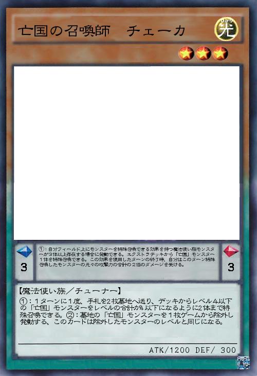 | ①:1ターンに1度、手札を2枚墓地へ送り、デッキからレベル4以下の「亡国」モンスターをレベルの合計が4以下になるように2体まで特殊召喚できる。②:墓地の「亡国」モンスターを1枚ゲームから除外し発動する、このカードは除外したモンスターのレベルと同じになる。 | |||