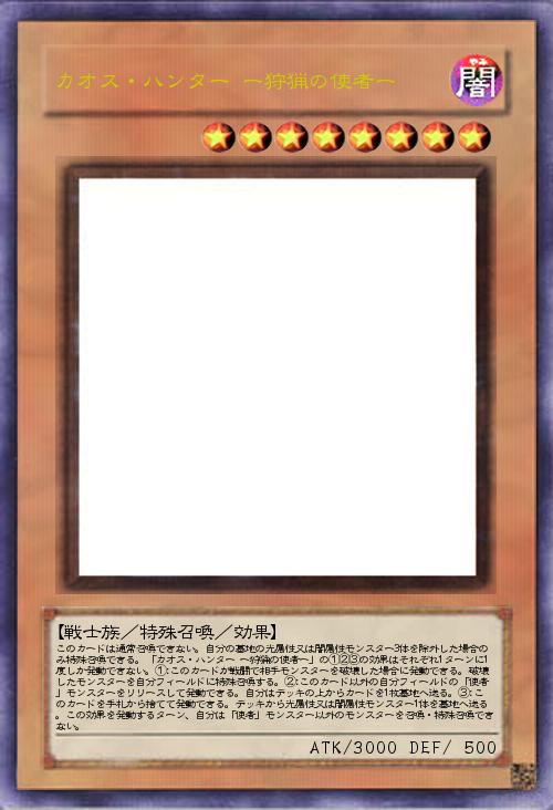 | このカードは通常召喚できない。自分の墓地の光属性又は闇属性モンスター3体を除外した場合のみ特殊召喚できる。「カオス・ハンター ー狩猟の使者ー」の①②③の効果はそれぞれ1ターンに1度しか発動できない。①:このカードが戦闘で相手モンスターを破壊した場合に発動できる。破壊したモンスターを自分フィールドに特殊召喚する。②:このカード以外の自分フィールドの「使者」モンスターをリリースして発動できる。自分はデッキの上からカードを1枚墓地へ送る。③:このカードを手札から捨てて発動できる。デッキから光属性又は闇属性モンスター1体を墓地へ送る。この効果を発動するターン、自分は「使者」モンスター以外のモンスターを召喚・特殊召喚できない。 | |||