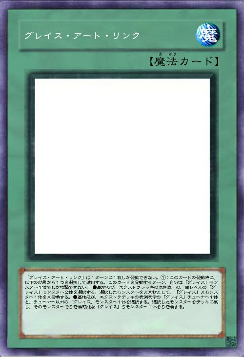 | 「グレイス・アート・リンク」は1ターンに1枚しか発動できない。①:このカードの発動時に、以下の効果から1つを選択して適用する。このカードを発動するターン、自分は「グレイス」モンスター1体でしか攻撃できない。 ●墓地及び、エクストラデッキの表側表示の、同レベルの「グレイス」モンスター2体を選択する。選択したモンスターをX素材として、「グレイス」Xモンスター1体をX召喚する。●墓地及び、エクストラデッキの表側表示の「グレイス」チューナー1体と、チューナー以外の「グレイス」モンスター1体を選択する。選択したモンスターをデッキに戻し、そのモンスターでS召喚可能な「グレイス」Sモンスター1体をS召喚する。 | |||