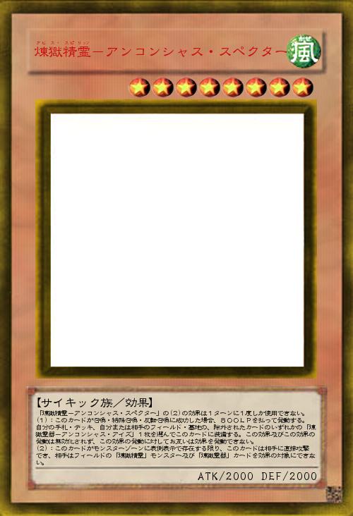 | 「煉獄精霊-アンコンシャス・スペクター」の(2)の効果は1ターンに1度しか使用できない。 (1):このカードが召喚・特殊召喚・反転召喚に成功した場合、800LPを払って発動する。自分の手札・デッキ、自分または相手のフィールド・墓地の、除外されたカードのいずれかの「煉獄霊器-アンコンシャス・アイズ」1枚を選んでこのカードに装備する。この効果及びこの効果の発動は無効化されず、この効果の発動に対してお互いは効果を発動できない。 (2):このカードがモンスターゾーンに表側表示で存在する限り、このカードは相手に直接攻撃でき、相手はフィールドの「煉獄精霊」モンスター及び「煉獄霊器」カードを効果の対象にできない。 | |||