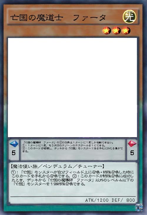 | ①:「亡国」モンスターが自分フィールド上に召喚・特殊召喚した時にこのカードを手札から召喚できる。②:このカードが特殊召喚に成功したとき、デッキから「亡国の魔導師 ファータ」以外のレベル4以下の「亡国」モンスターを1体特殊召喚できる。 | |||
