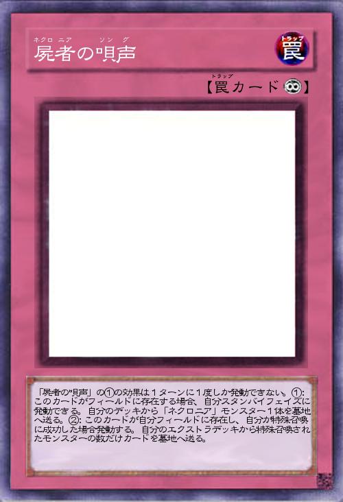 | 「屍者の唄声」の①の効果は1ターンに1度しか発動できない。①:このカードがフィールドに存在する場合、自分スタンバイフェイズに発動できる。自分のデッキから「ネクロニア」モンスター1体を墓地へ送る。②:このカードが自分フィールドに存在し、自分が特殊召喚に成功した場合発動する。自分のエクストラデッキから特殊召喚されたモンスターの数だけカードを墓地へ送る。 | |||