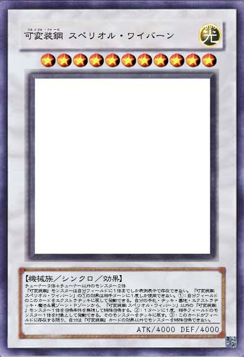 | チューナー3体+チューナー以外のモンスター2体 「可変装鋼」モンスターは自分フィールドに1体までしか表側表示で存在できない。「可変装鋼 スペリオル・ワイバーン」の①の効果は相手ターンに1度しか使用できない。①:自分フィールドのこのカードをエクストラデッキに戻して発動できる。自分の手札・デッキ・墓地・エクストラデッキ・魔法&罠ゾーン・Pゾーンから、「可変装鋼 スペリオル・ワイバーン」以外の「可変装鋼」モンスター1体を召喚条件を無視して特殊召喚する。②:1ターンに1度、相手フィールドのモンスター1体を対象として発動できる。そのモンスターをデッキに戻す。③:このカードがフィールドに存在する限り、自分は「可変装鋼」カードの効果以外でモンスターを特殊召喚できない。 | |||