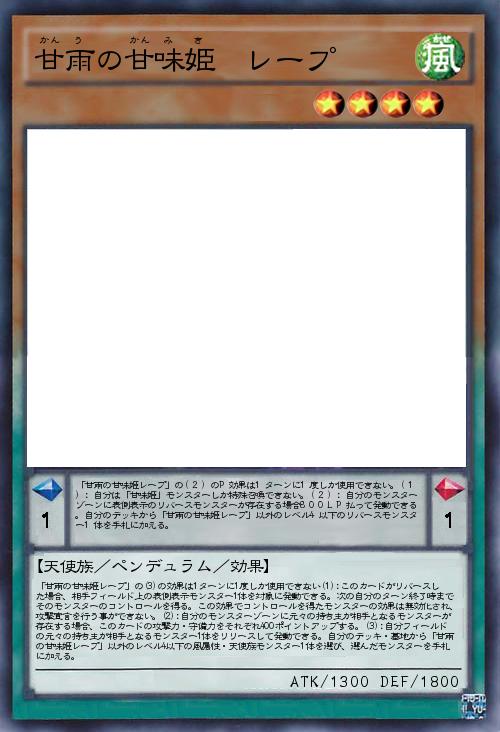 | 「甘雨の甘味姫レープ」の(3)の効果は1ターンに1度しか使用できない(1):このカードがリバースした場合、相手フィールド上の表側表示モンスター1体を対象に発動できる。次の自分のターン終了時までそのモンスターのコントロールを得る。この効果でコントロールを得たモンスターの効果は無効化され、攻撃宣言を行う事ができない。(2):自分のモンスターゾーンに元々の持ち主が相手となるモンスターが存在する場合、このカードの攻撃力・守備力をそれぞれ400ポイントアップする。(3):自分フィールドの元々の持ち主が相手となるモンスター1体をリリースして発動できる。自分のデッキ・墓地から「甘雨の甘味姫レープ」以外のレベル4以下の風属性・天使族モンスター1体を選び、選んだモンスターを手札に加える。 | |||