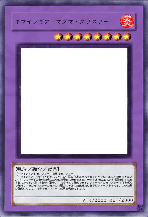 | 「キマイラギア」モンスター+炎属性モンスター 「キマイラギア-マグマ・グリズリー」の①②の効果はそれぞれ1ターンに1度しか使用できない。①:このカードが特殊召喚に成功した場合に発動できる。デッキまたは墓地から「融合」1枚を手札に加える。②:手札の「融合」1枚を捨てて発動できる。フィールドのモンスター1体を選んで除外し、そのモンスターの元々の攻撃力の半分の数値分だけ相手にダメージを与える。この効果の発動に対して、相手はモンスターの効果を発動できない。 | |||