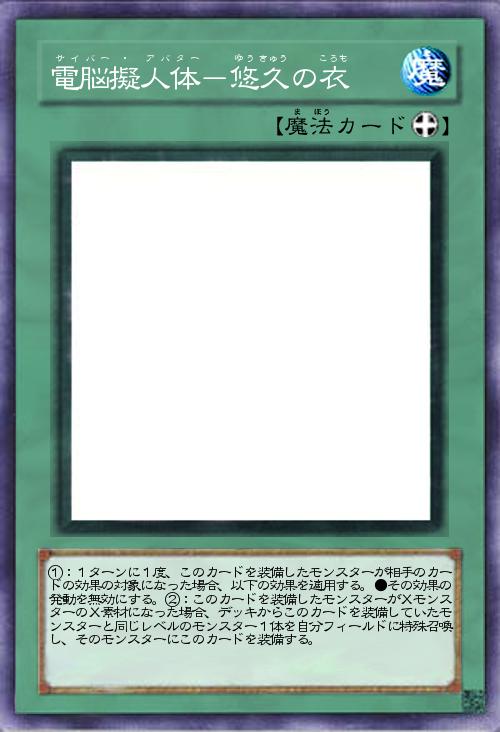 | ①:1ターンに1度、このカードを装備したモンスターが相手のカードの効果の対象になった場合、以下の効果を適用する。●その効果の発動を無効にする。②:このカードを装備したモンスターがXモンスターのX素材になった場合、デッキからこのカードを装備していたモンスターと同じレベルのモンスター1体を自分フィールドに特殊召喚し、そのモンスターにこのカードを装備する。 | |||