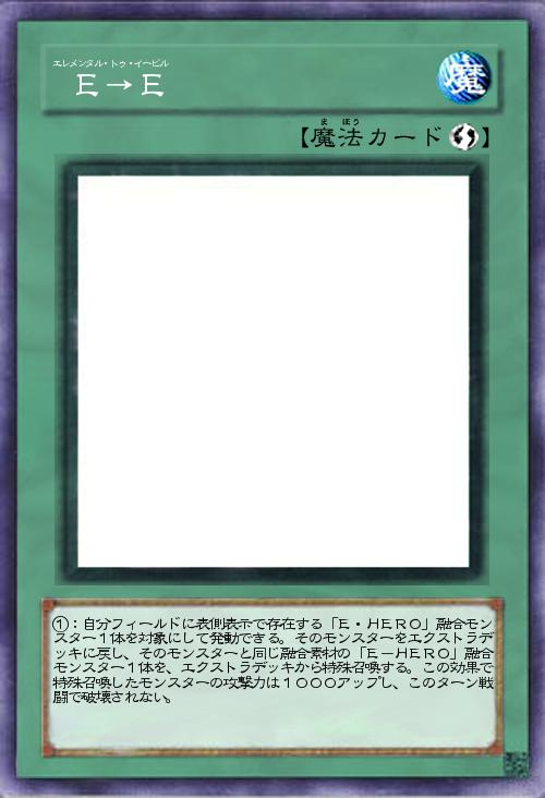 | ①:自分フィールドに表側表示で存在する「E・HERO」融合モンスター1体を対象にして発動できる。そのモンスターをエクストラデッキに戻し、そのモンスターと同じ融合素材の「E-HERO」融合モンスター1体を、エクストラデッキから特殊召喚する。この効果で特殊召喚したモンスターの攻撃力は1000アップし、このターン戦闘で破壊されない。 | |||