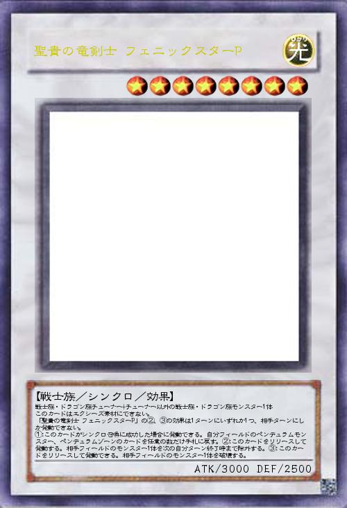 | 戦士族・ドラゴン族チューナー+チューナー以外の戦士族・ドラゴン族モンスター1体 このカードはエクシーズ素材にできない。 「聖貴の竜剣士 フェニックスターP」の②、③の効果は1ターンにいずれか1つ、相手ターンにしか発動できない。 ①:このカードがシンクロ召喚に成功した場合に発動できる。自分フィールドのペンデュラムモンスター、ペンデュラムゾーンのカードを任意の数だけ手札に戻す。②:このカードをリリースして発動する。相手フィールドのモンスター1体を次の自分ターン終了時まで除外する。③:このカードをリリースして発動できる。相手フィールドのモンスター1体を破壊する。 | |||