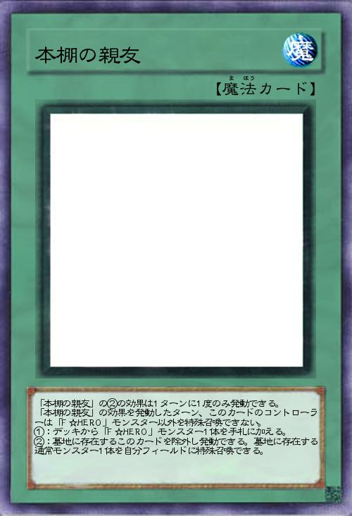 | 「本棚の親友」の②の効果は1ターンに1度のみ発動できる。 「本棚の親友」の効果を発動したターン、このカードのコントローラーは「F☆HERO」モンスター以外を特殊召喚できない。 ①:デッキから「F☆HERO」モンスター1体を手札に加える。 ②:墓地に存在するこのカードを除外し発動できる。墓地に存在する通常モンスター1体を自分フィールドに特殊召喚できる。 | |||