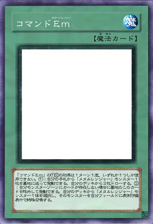 | 「コマンドEm」の①②の効果は1ターン1度、いずれか1つしか使用できない。①:自分の手札から「メタルレンジャー」モンスター1枚を墓地に送って発動できる。自分のデッキから2枚ドローする。②:自分モンスターゾーンにカードが存在しない場合に墓地のこのカードを除外して発動できる。自分のデッキから「メタルレンジャー」モンスター1体を選択し、そのモンスターを自分フィールドに表側守備表示で特殊召喚する。 | |||