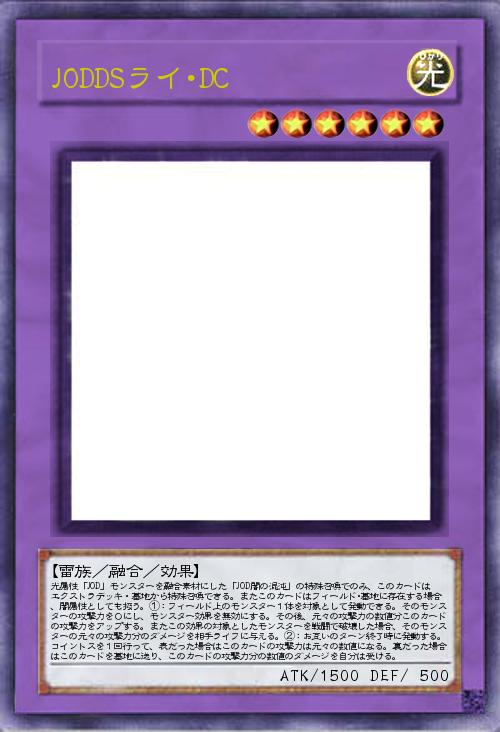 | 光属性「JOD」モンスターを融合素材にした「JOD闇の混沌」の特殊召喚でのみ、このカードはエクストラデッキ・墓地から特殊召喚できる。またこのカードはフィールド・墓地に存在する場合、闇属性としても扱う。①:フィールド上のモンスター1体を対象として発動できる。そのモンスターの攻撃力を0にし、モンスター効果を無効にする。その後、元々の攻撃力の数値分このカードの攻撃力をアップする。またこの効果の対象としたモンスターを戦闘で破壊した場合、そのモンスターの元々の攻撃力分のダメージを相手ライフに与える。②:お互いのターン終了時に発動する。コイントスを1回行って、表だった場合はこのカードの攻撃力は元々の数値になる。裏だった場合はこのカードを墓地に送り、このカードの攻撃力分の数値のダメージを自分は受ける。 | |||